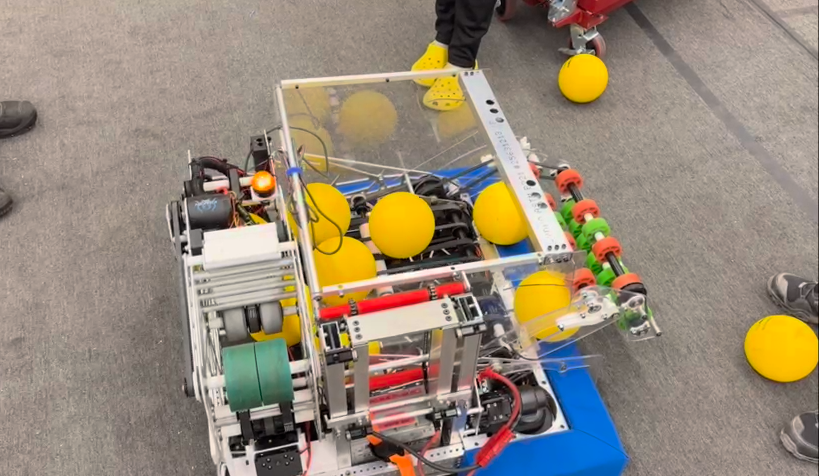Indexer: Now we’re on the indexer which is a small magazine like tunnel which feeds fuel into the shooter for scoring, we started with a full hopper running the belts into the indexer which is also running, This worked well with the indexer even ejecting fuel in the way at the top when the shooter wasn’t running. Now that everything else works, we had mechanical install the bellypan so we can move onto moving tests.